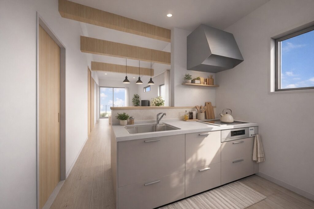 リビングとの会話を楽しめる対面キッチン。収納もたっぷりです。