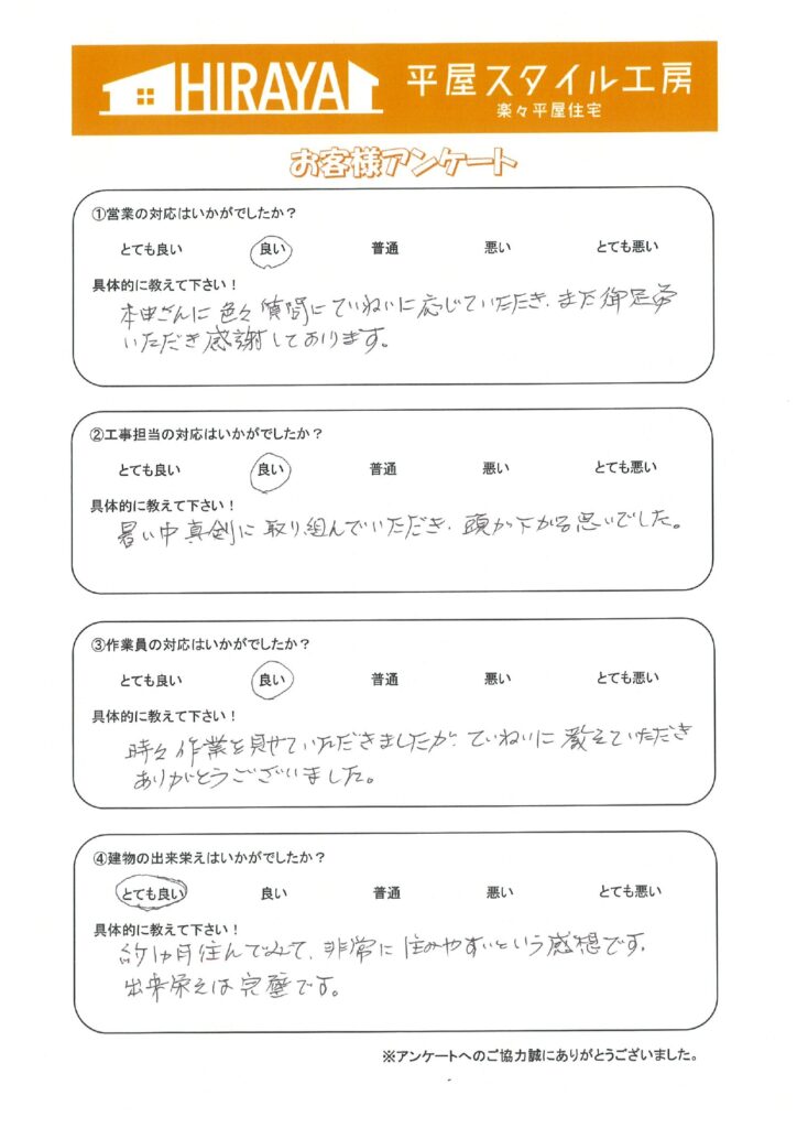 時々作業を見せて頂きましたが、ていねいに教えていただきありがとうございました。 - Q.建物の出来栄えはいかがでしたか?