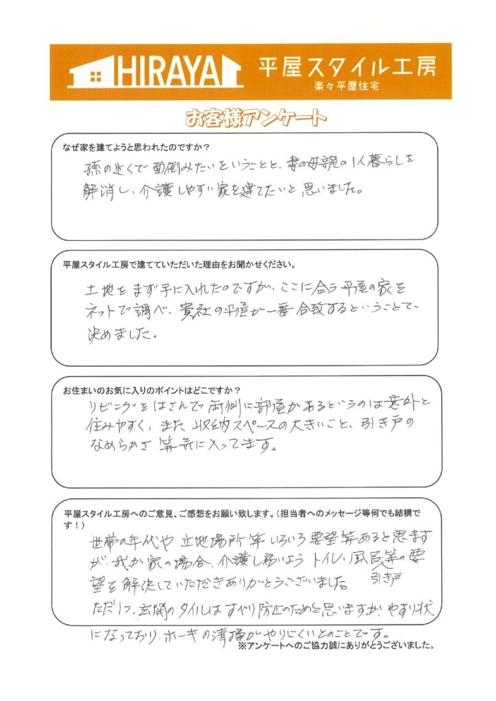 - 孫の近くで面倒を見たいということと、妻の母親の一人暮らしを解消し、介護しやすい家を建てたいと思いました。