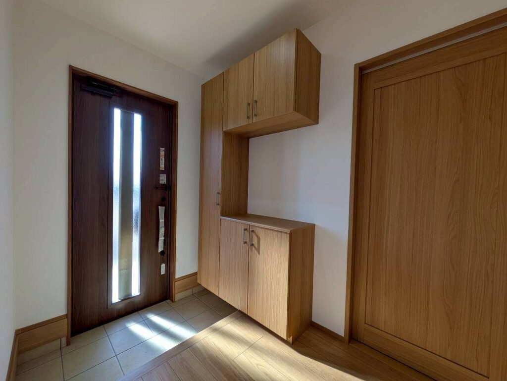 玄関ホールには、家族全員の靴をすっきり収められる機能的なシューズボックスを採用。