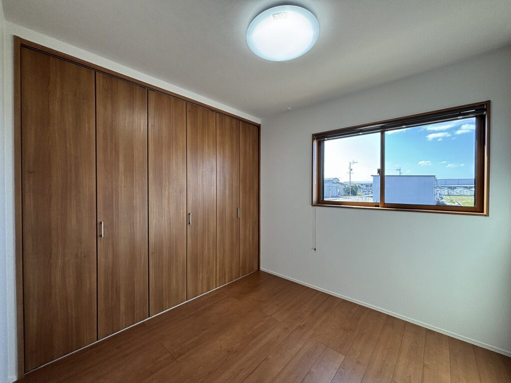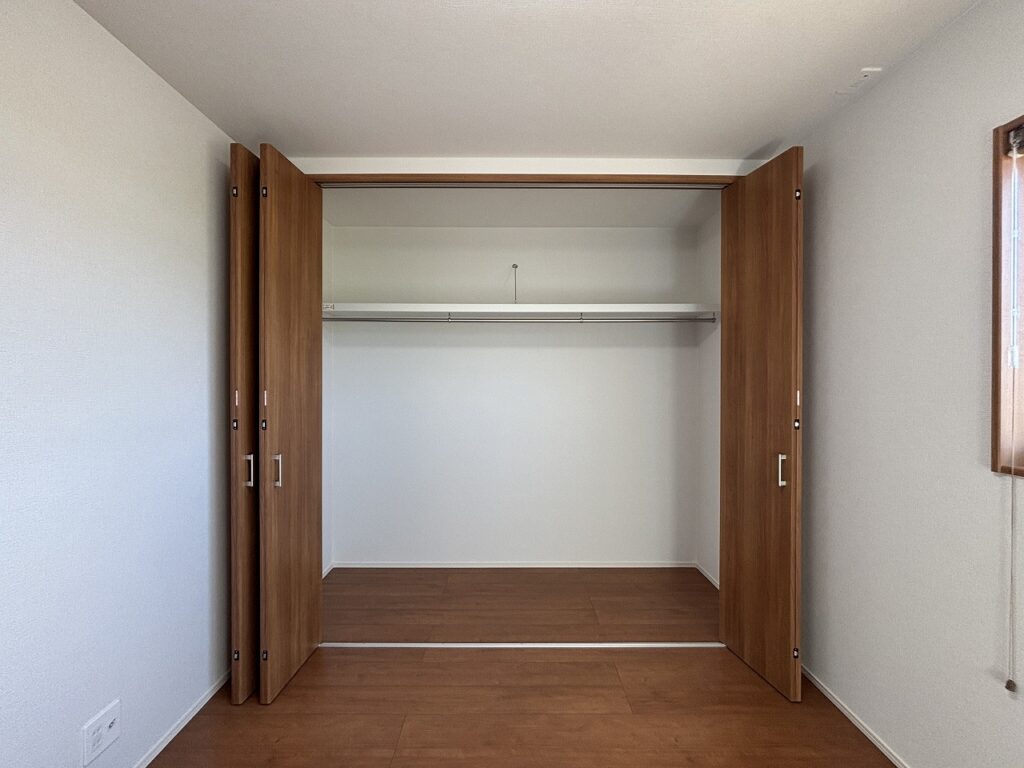 温かみのある木目調のフローリングと、壁一面の大型クローゼットが特徴の洋室です。収納力が豊富なので、お部屋を広く使えます。