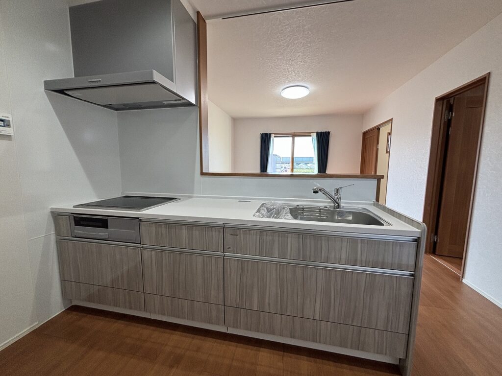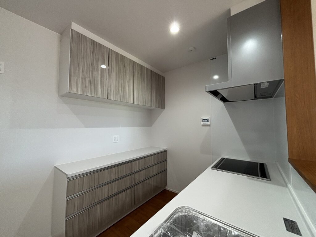 落ち着いた木目調の面材が空間にやさしくなじみ、リビングとの一体感を演出しています。