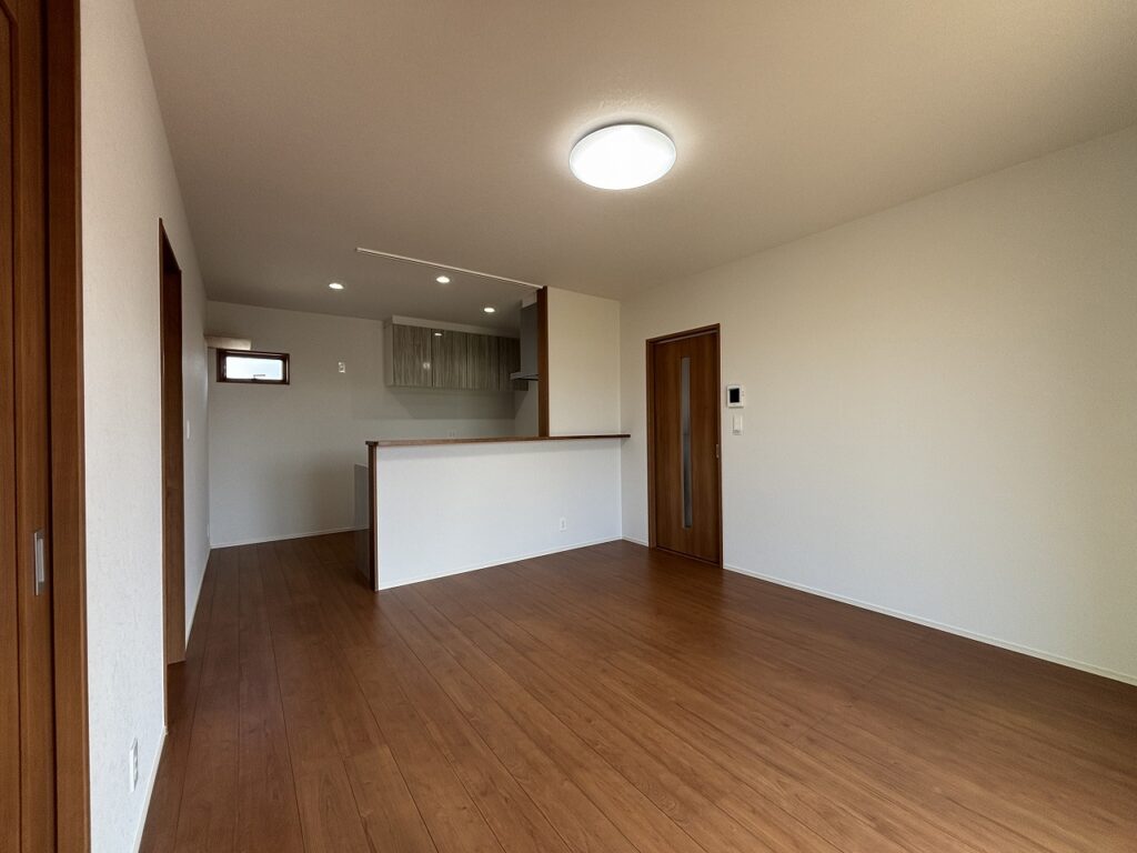 白を基調とした壁と、温かみのある木目フローリングが調和し、シンプルながら居心地の良い空間に。