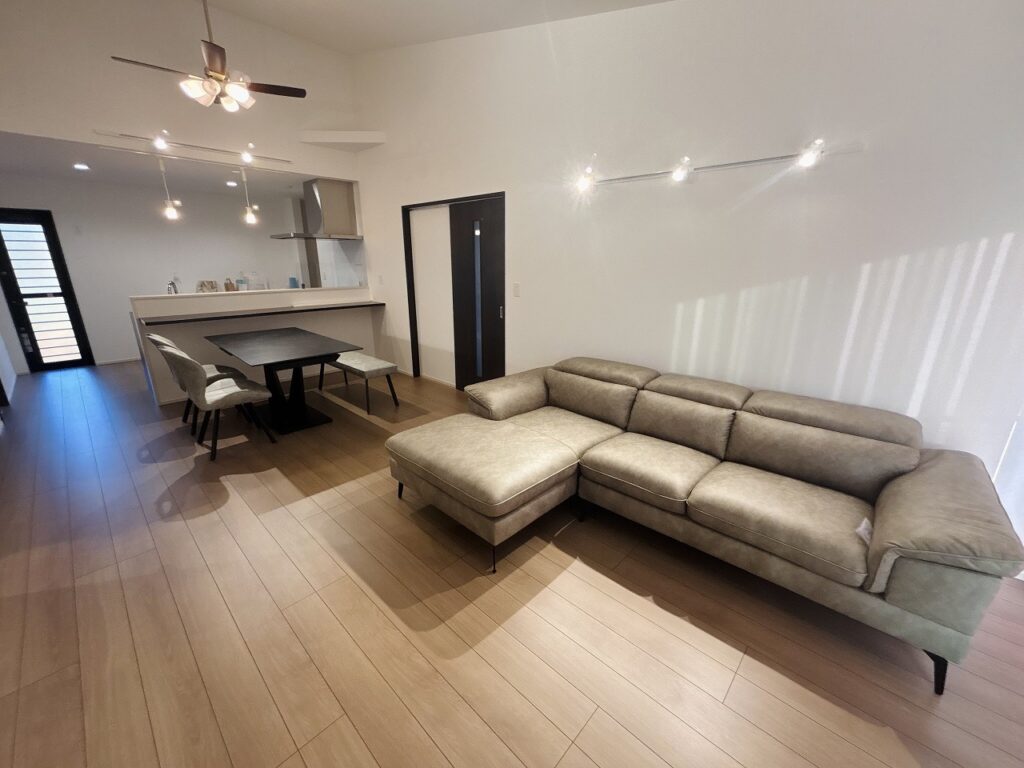 キッチンからダイニング、リビングまで見渡せる一体空間で、家族のつながりを感じられる設計です。落ち着いた色合いのインテリアが、上質で心地よい暮らしを演出します。