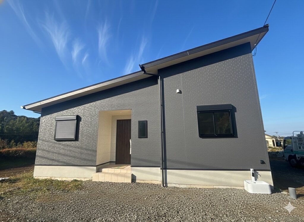 落ち着いたグレーの外壁とシャープな片流れ屋根が印象的で、周囲の景観にも調和しながら存在感を放ちます。